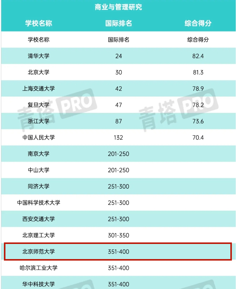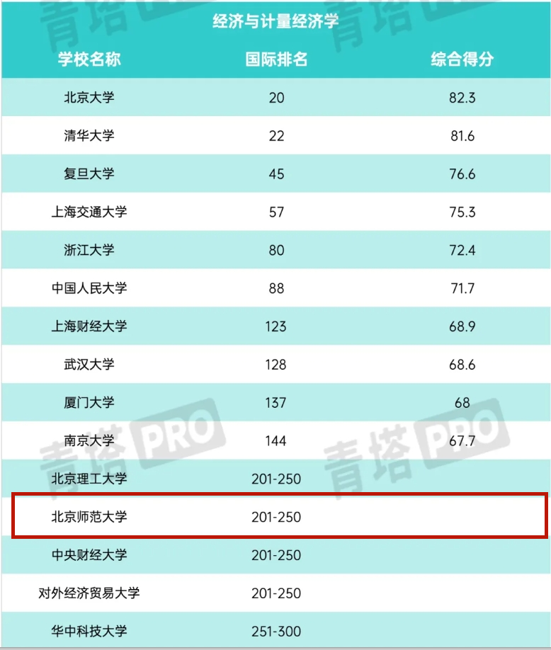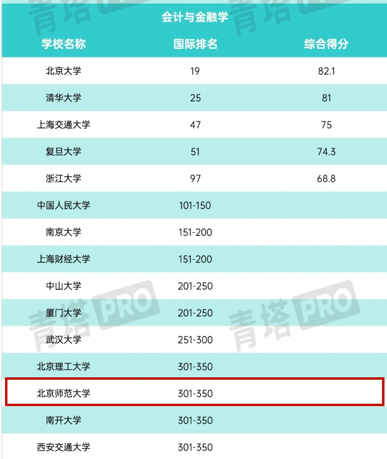 On 10 April 2024, QS announced the 2024 World University Rankings by Subject, which covers 60 subjects across five subject areas. Beijing Normal University has a total of 25 disciplines on the list, among which Economics and Econometrics rank 12th among mainland universities; Accounting and Finance, Business and Management Studies ranked 13th among mainland universities.