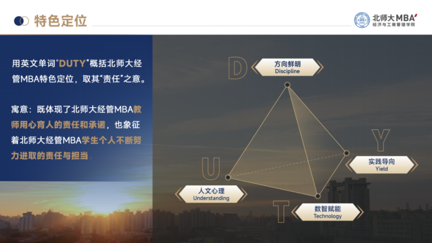 Professor Zhou first introduced the new training system of BNU MBA constructed based on four dimensions: Discipline, Understanding, Technology, and Yield, taking the initials of these dimensions as "DUTY"—the core philosophy of BNU MBA education. "DUTY" implies "responsibility", reflecting both the faculty's commitment to educating with dedication and the students' pursuit of excellence.