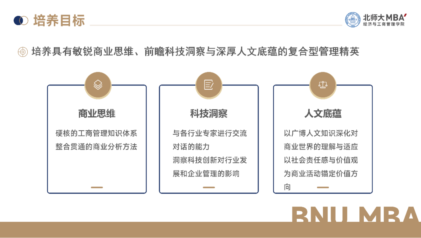 In terms of talent cultivation goals, BNUBS' MBA program aims to nurture comprehensive management elites with keen business thinking, forward-looking technological insight, and profound humanistic heritage, whose core values will run through multiple dimensions of personal development, organizational needs, and social progress.