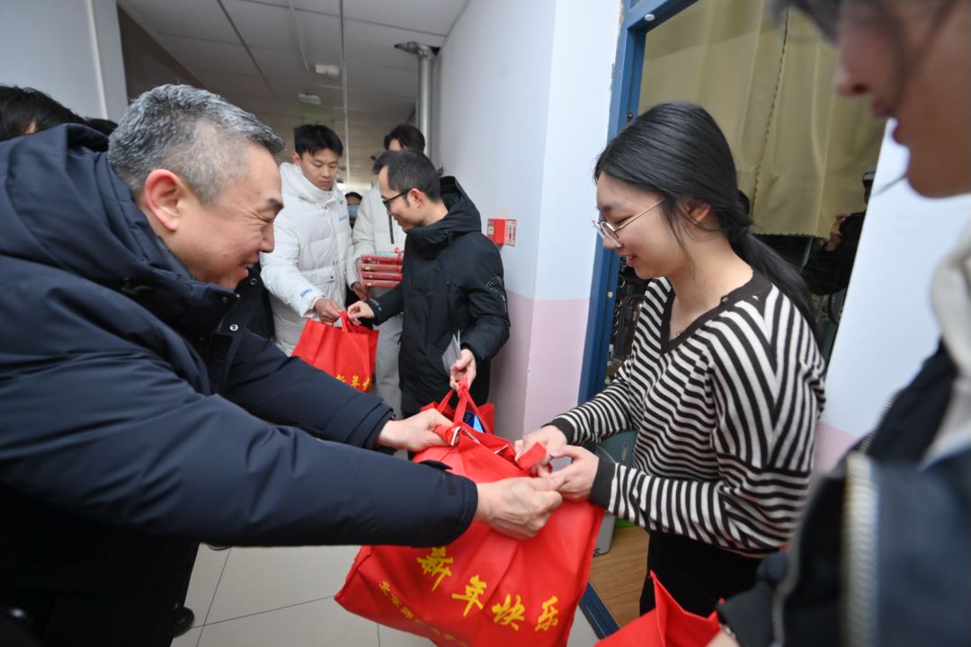 Subsequently, Sun Zhijun, Secretary of the Party Committee of the School, Han Lili, Associate Secretary of the School, and Tang Honghong, Director of the 2020 doctoral class, went to Changping Campus to visit the doctoral students, sent New Year gift packages, learned about everyone's life and scientific research, and extended sincere greetings and New Year wishes to the students and their families.