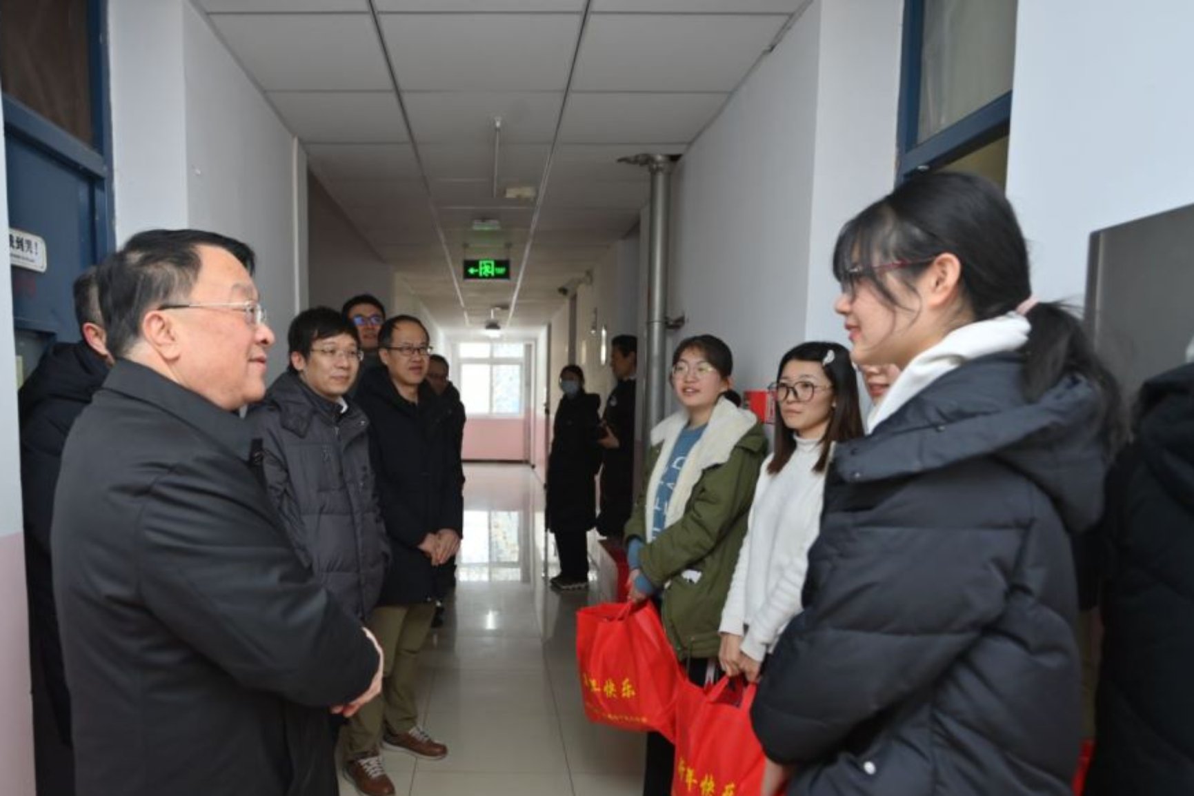 On the morning of February 2, 2024, Party Secretary Cheng Jianping, Associate Party secretary Li Xiaobing and Vice President Chen Xing visited studentsstaying in the university during the winter vacationof our School. Responsible comrades of the Party Committee/Dean's Office, the student work Department of the Party Committee, the General Affairs Department and the School Youth League Committee, Party Secretary Sun Zhijun, Associate Party Secretary Han Lili and other relevant personnel attended.Cheng Jianping, Li Xiaobing and Chen Xing visited the students in our School, got an in-depth understanding of the students' study and life at School, carefully asked the students about their vacation arrangements, career planning and needs, and presented New Year gift packages to send New Year wishes to the students.