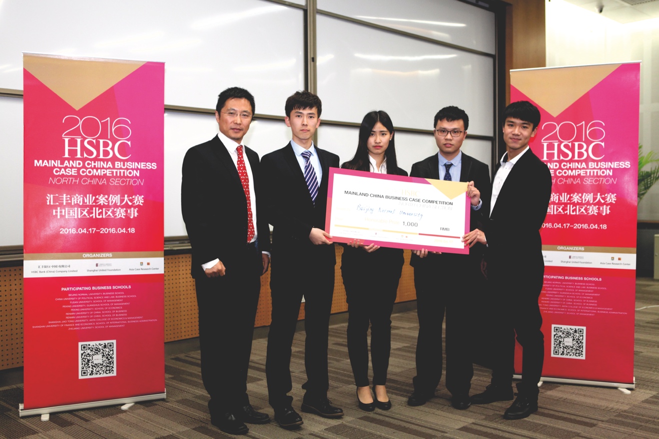 On April 17th, the “2016 HSBC Mainland China Business Case Competition” was held in Peking University - Guanghua Management School. This competition is mutually organized by the Hongkong and Shanghai Banking Corporation Limited (HSBC) and the Asia Case Research Center (ACRC) of the University of Hong Kong. Ten attending teams came from prestigious universities such as the Peking University, Renmin University and Fudan University. After intensive competition, the BNU team represented by Zou Caiwen, Liang Zuming, Han Jiabao and Gao Yufei became the grand winner under the guidance of their team teacher Mr. Jiao Hao.