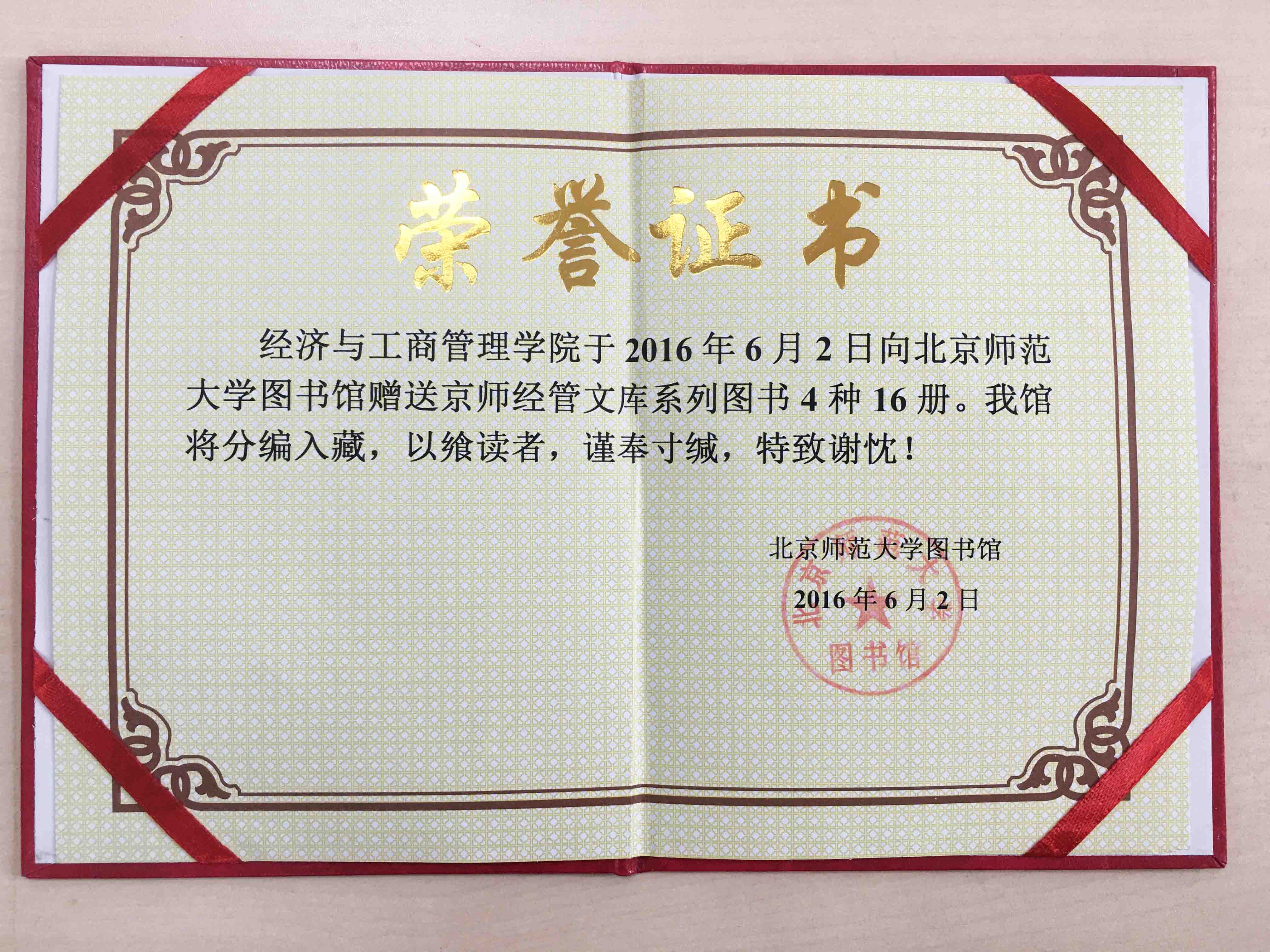 Certificate of Donating “BNU Business School Book Series” to the University Library