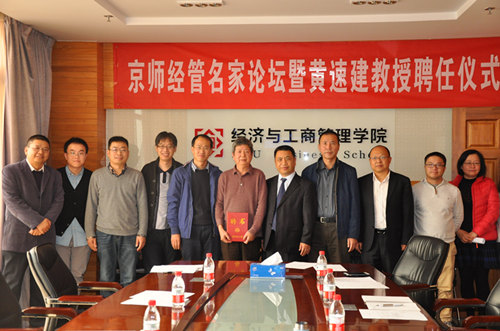 First of all, Mr. Sun Zhijun delivered an opening remark, expressed warm welcome to Prof. Huang Sujian for his visit to BNUBS, and a sincere wish for attentions and supports to our school. Prof. Qi Jindong introduced the education background, research direction, publications of Prof. Huang Sujian. Dean Mr. Lai Desheng once again extended warm welcome and congratulations to Prof. Huang, and handed over the appointment certificate to him. Then, they took a group photo with the teachers and students presented.