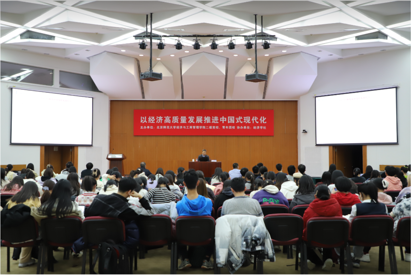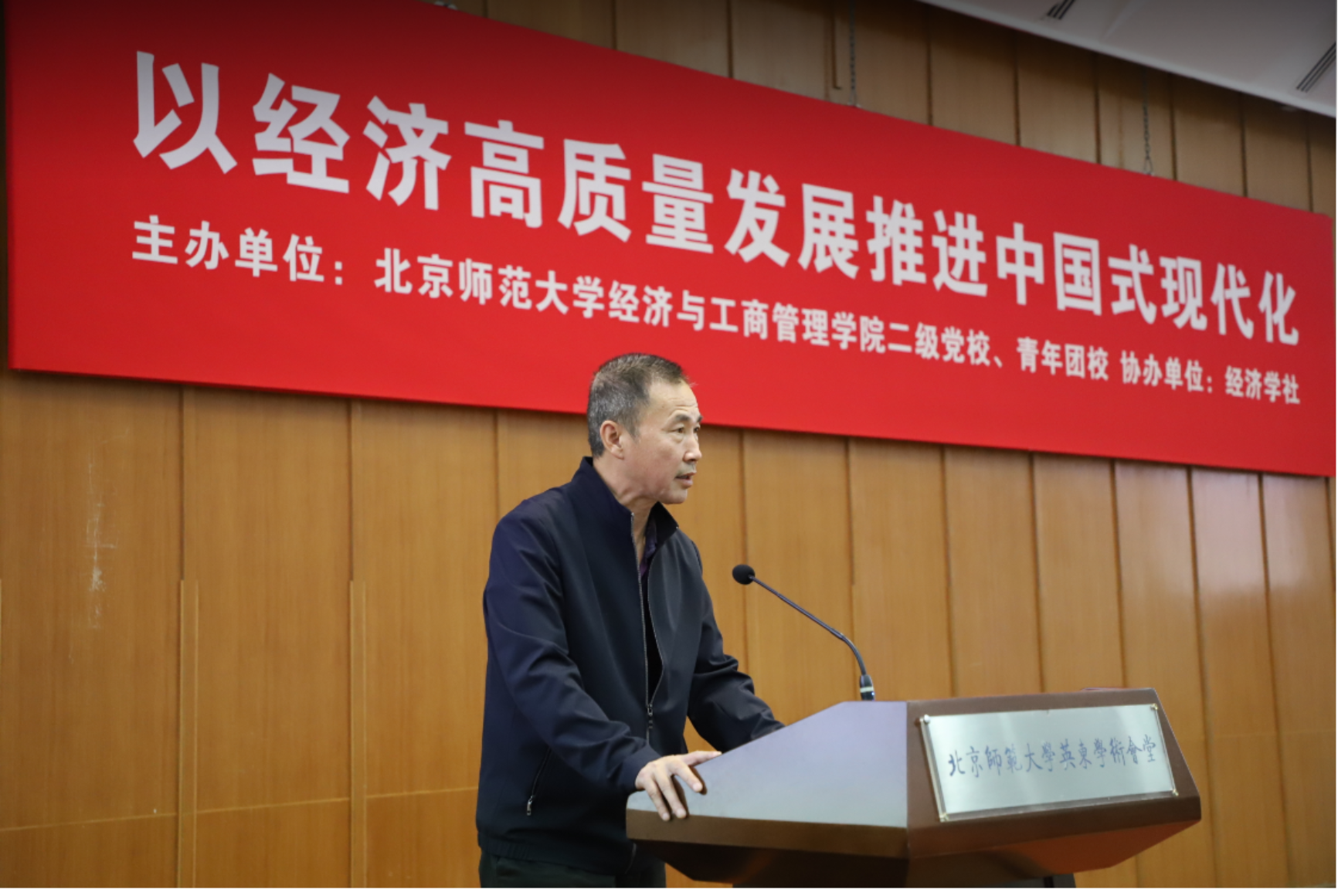 On November 22, 2023, the theoretical lecture "Promoting Chinese Modernization through High-quality Development" was held in the lecture hall on the second floor of Yingdong Academic Hall. This lecture is sponsored by the second-level Party School and Youth League School of BNUBS, co-organized by the Economic Society, and is also the 121st lecture of the "BNUBS Economic Management ·Expert Forum". More than 180 people from the 15th session of the secondary Party School of BNUBS, including students, teachers, party members and party membership activists, participated in the lecture.