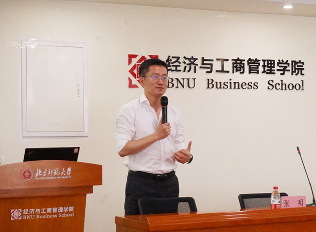 On the occasion of the 40th anniversary of the School of Economics, the 2ed Lecture of Economics School 40th Anniversary Alumni Forum Was Successfully Held on May 29, 2019. At the invitation of the Alumni Association of Beijing Normal University and the Alumni Association of the School, Zhang Ming, researcher and doctoral supervisor of the Institute of World Economy and Politics, Chinese Academy of Social Sciences, as the guest speaker, gave a wonderful speech to the teachers and students of our School with the topic of "the strategic transformation of RMB internationalization: from the 'old trinity' to the 'new trinity'". Zhang Ming is the 99th undergraduate and the 2002nd master of our School. Qi Yudong, dean of the School, attended the event. The lecture was presided over by Ge Yuliang, deputy secretary of the sub-party committee and executive vice President of the Alumni Association.