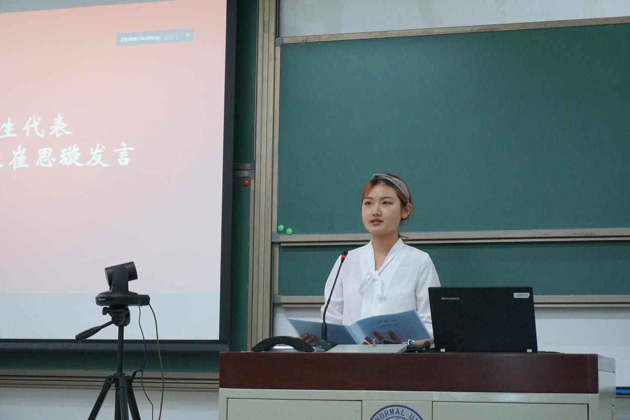 Representative of the new graduate students is Cui Sixuan from the Department of Accounting. She expressed her deep respect for the frontline workers, school leaders and teachers who have worked hard for the opening of the school, and explained the new meaning of “managing people in the capital” from four aspects, namely, cultural accomplishment, social responsibility, study and inheritance.
