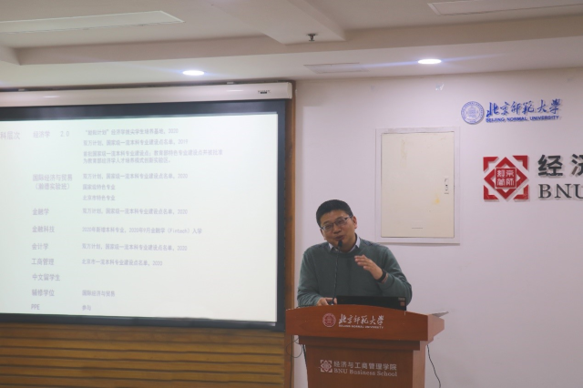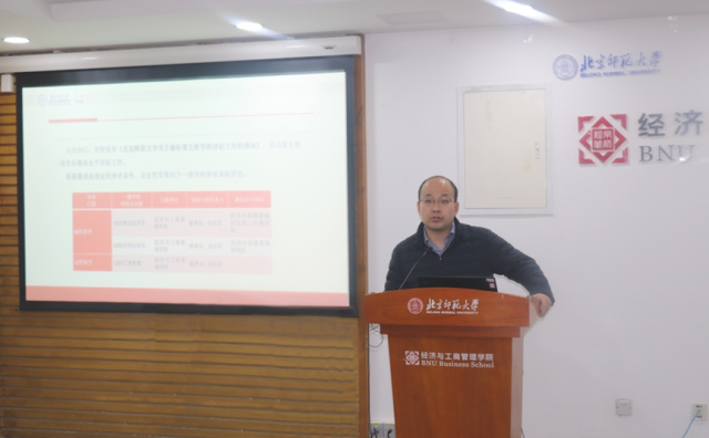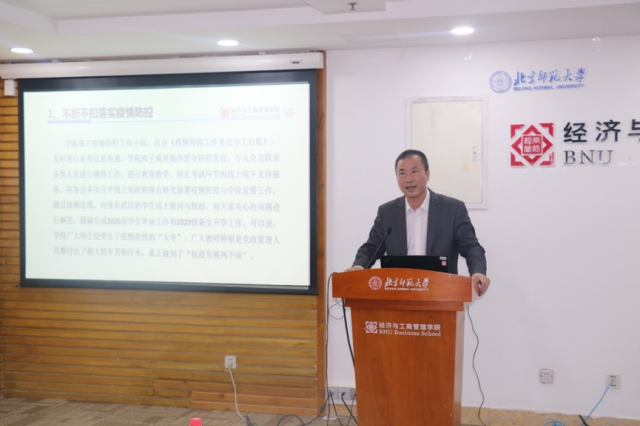Associate Dean Cai Hongbo made a report on the discipline construction, scientific research, internationalization, Zhuhai campus and postdoctoral work of the college. In terms of discipline construction, we have actively deployed and completed the fifth round of discipline evaluation, optimized the budget planning and management of discipline construction funds, and successfully completed the summary of the 13th Five-Year Plan and the draft of the 14th Five-Year Plan. In terms of scientific research, our teachers have made remarkable achievements in national and provincial projects and international cooperation projects. Awards obtained in the national level, from the Ministry of Education and in the Beijing Municipal level have reached a new high. Papers published in top international journals continued to make new records. We have hosted six high-level academic conferences and held more than 100 lectures for masters of economics and management in Beijing. In terms of international exchange and cooperation, we have developed an online management platform for overseas students, cooperated with overseas universities for online courses and online lecture series, and won the approval of the university's international economic organization cooperation construction platform. In the international competitiveness monitoring index and analysis report of each department released by Beijing Normal University in 2020, BNUBS was taking the lead in the internationalization level. When it comes to Zhuhai Campus, we have promoted the construction of three professional master's degree programs, completed the assessment of international business master's level, and at the same time cooperated with the teaching and professional construction of Economics, Finance and Social Science Experimental Classes and the second degree of Accounting. In terms of postdoctoral work, the standards for the entry and exit of postdocs have been revised to further standardize and improve the training level of postdocs.