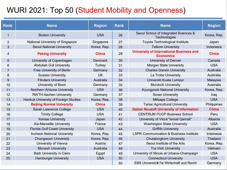Figure 4: Global top 50 rankings in 2021 WURI in “Student Exchange and Openness”