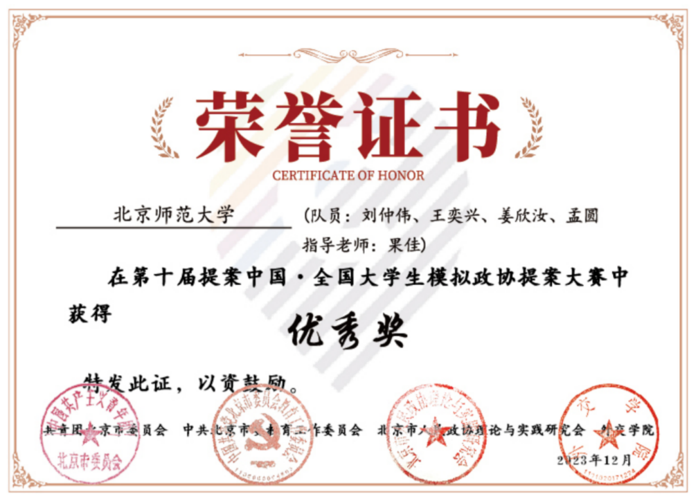 Through the expert selection organized by the Beijing League Committee, the proposal of undergraduate students Liu Zhongwei and Jiang Xinru, On Improving the Social insurance system of Takeout Riders, was awarded the "Beijing Excellent Proposal" and participated in the national competition on behalf of Beijing Normal University.Forty teams from all over the country gathered at the Central Institute of Socialism and competed together on stage. Undergraduate students Liu Zhongwei and Jiang Xinru presented and responded to the judges' questions. In the end, the proposal works participated by our students were awarded the Excellence Award of the Proposal China · National College Students CPPCC Proposal Simulation Competition