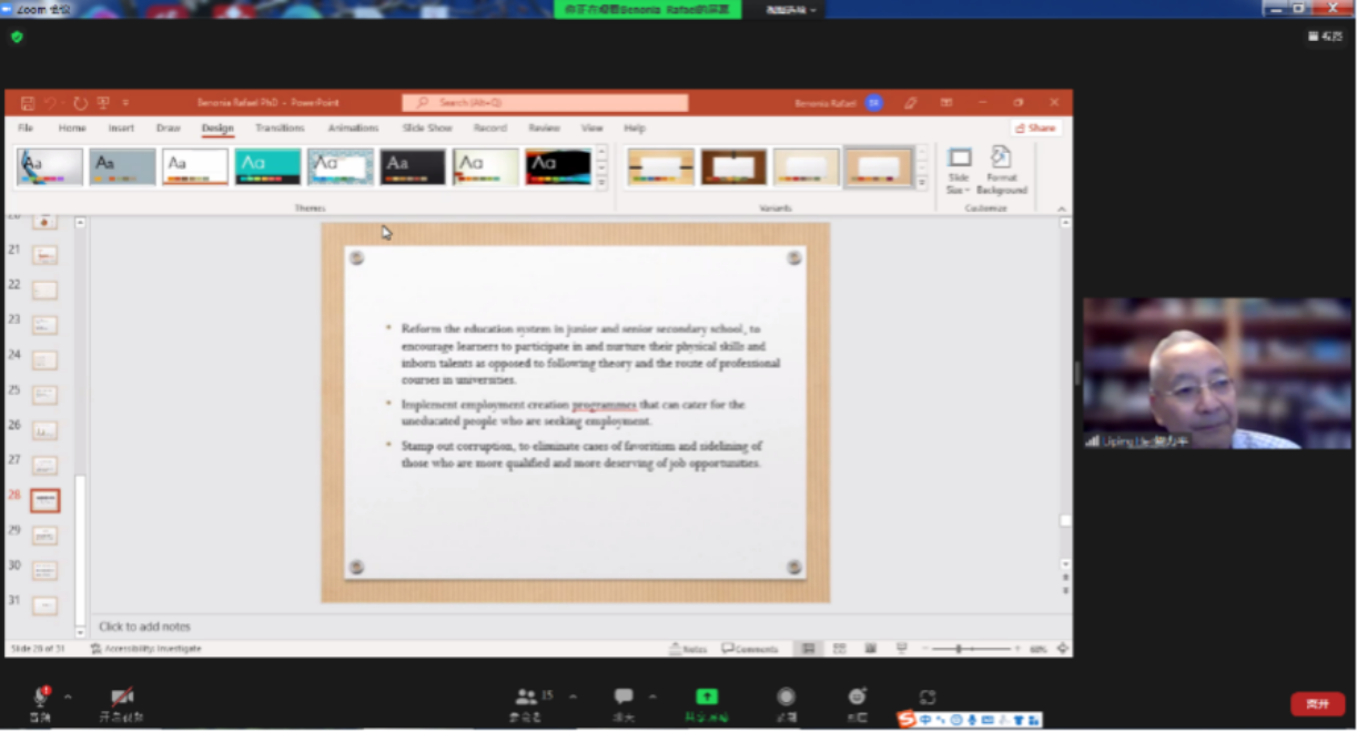 The first three academic reports in the morning focused on the themes of international trade, direct investment and innovation, while the second four academic reports in the afternoon focused on the themes of unemployment in developing countries, economic growth, financing constraints and blockchain. The reviewers gave detailed guidance from the theoretical perspective to the empirical method, and from the academic value to the social significance of the report. Professor Yang Chengyu pointed out that international students should think about the logic of research from the perspective of research questions more systematically and find out the proposition of research. Professor He Liping hopes that international students will learn from the international education programs at Beijing Normal University, which will help them use academic research to solve the major economic development problems in their countries.