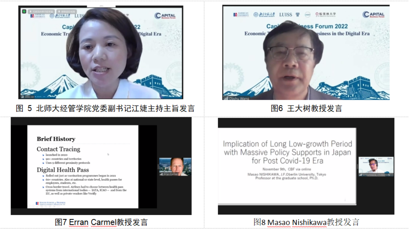 The first keynote speech was presided over by Jiang Jie, Associate Secretary of the Party Committee of BNUBS. Masao Nishikawa’s speech titled "Implication of Long Low-growth Period with Massive Policy Supports in Japan for Post Covid-19 Era", is based on his more than 30 years of working experience in the Cabinet Office of Japan and academic research.  He pointed out that in the face of long-term low economic growth after the epidemic, the government should maintain policy support and flexibility to help the society recover vitality. Professor Erran Carmel wrote the letter "Pandemic Megasystems: "A New Framing and Lessons from Failures" summarizes the solutions and practices of more than 90 countries in the world in the face of COVID-19, summarizes the experience and lessons, and proposes a new framework for global epidemic prevention. With the title "Increase the Non-contact Elements, Develop Beijing's Digital Economy", Professor Wang Dashu combined with Beijing's epidemic prevention practices and suggested promoting the expansion of non-contact elements in the capital's economy. Using the digital economy to mitigate and respond to the impact of the pandemic. Associate Professor Gong Shiyang delivered a lecture titled "Powering Consuming Insights in a Digital World", sharing research findings and views on how to promote the transformation of consumption concepts in the era of digital economy.