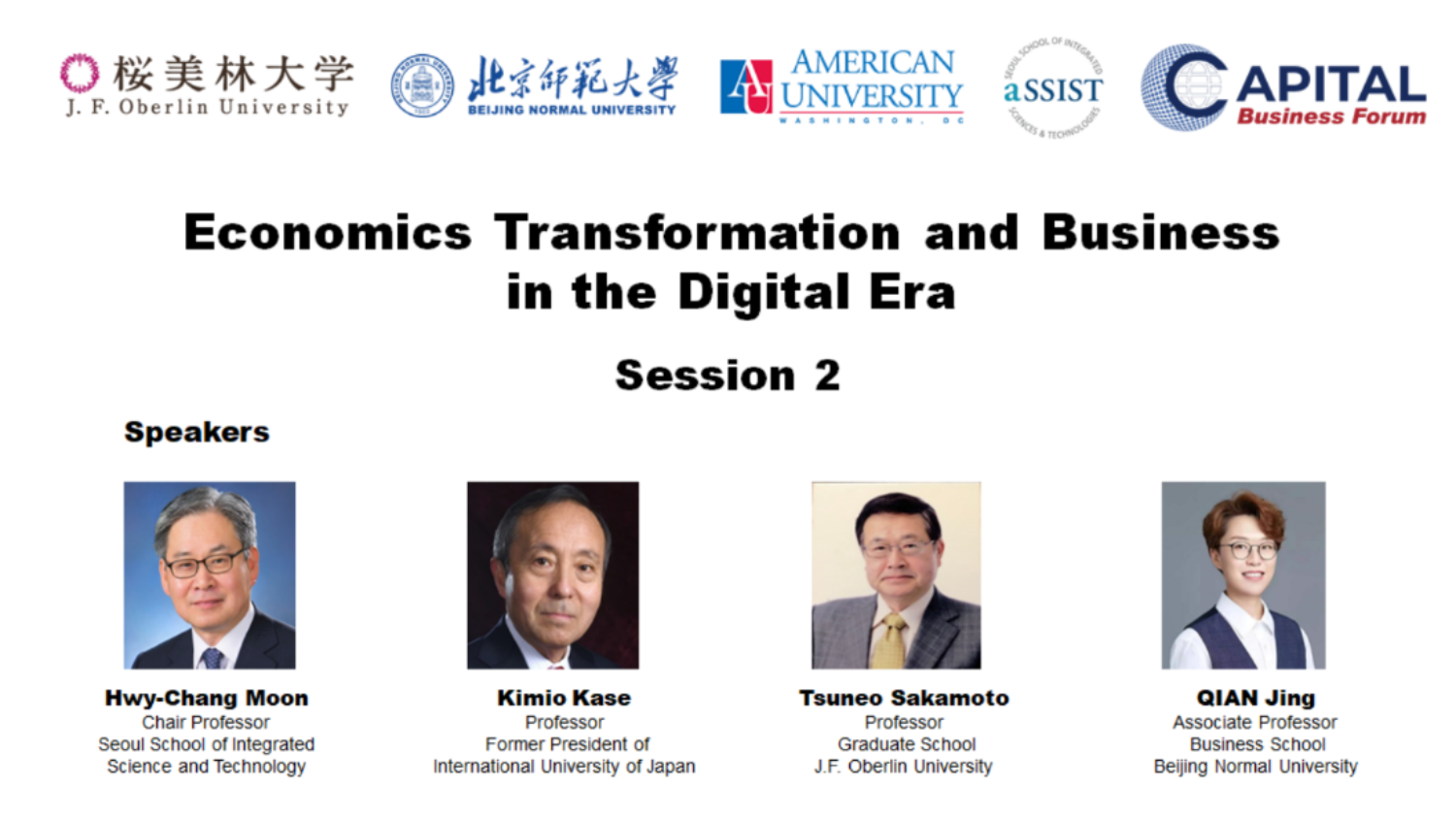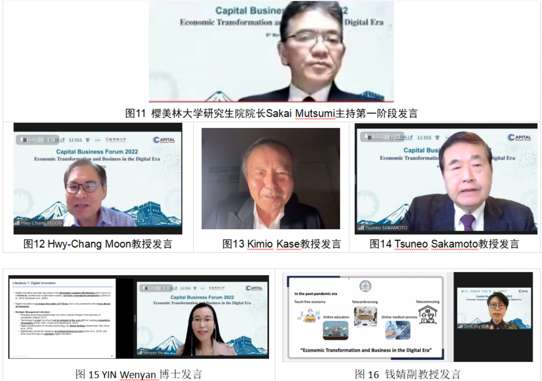 The first session of the afternoon was presided over by Sakai Mutsumi, Dean of the Graduate School of J.F. Oberlin University.  Professor Hwy-Chang Moon and Dr. YIN Wenyan focused on "Changing Patterns of Core Competence in the Digital Era: A case of Tesla Inc., "explores how latecomers in industries with high barriers to entry can win over incumbents. Professor KimioKase's talk was titled Can the Analogical Learning Process be Digitally Handled? Through case studies, he discusses how to use digital technology to learn by analogy. Prof. Tsuneo Sakamoto named "The Benefits and Limitations of Sustainable Finance" and put forward the positive effects and limitations of financial sustainable development. Associate Professor Qian Jing's speech topic is "How could Digital Transformation Make Cities Better?" She vividly illustrates how digital technology has profoundly changed modern life and how it has made people's lives easier and more convenient.
