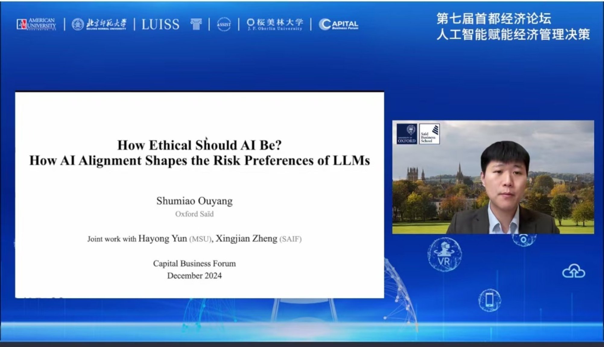 Assistant Professor Ouyang Shumiao from Oxford University gave a presentation on "How Ethical Should AI Be? How AI Alignment Shapes the Risk Preferences of LLMs", focusing on the "decision-making process of the human brain" and "decision-making and analysis of big language models", highlighting that both are influenced by the "Risk Preference" factor in their decision-making process. He pointed out that Large Language Models (LLMs) are not ethically neutral, and alignment has a significant impact on financial decision-making, and the degree of alignment needs to be carefully calibrated according to specific financial applications.