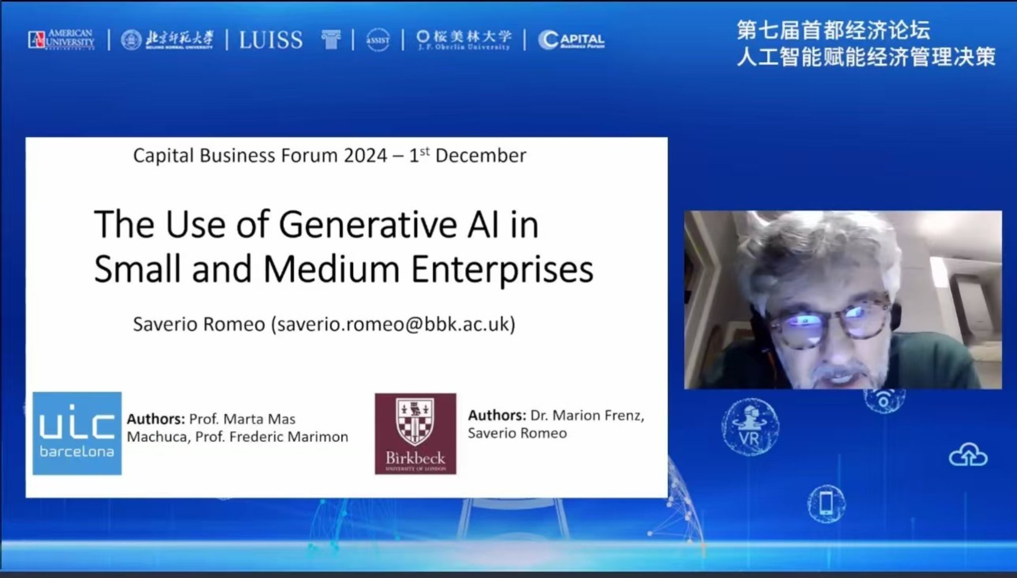 Savirio Romeo, Senior Lecturer at Baker College, University of London, discussed the topic of "The Use of Generative AI in Small Businesses" from several aspects, including research background, sample description and analysis, and conclusions. He pointed out that generative artificial intelligence tools have become a part of daily work and life, and the application of generative artificial intelligence has improved employee performance.