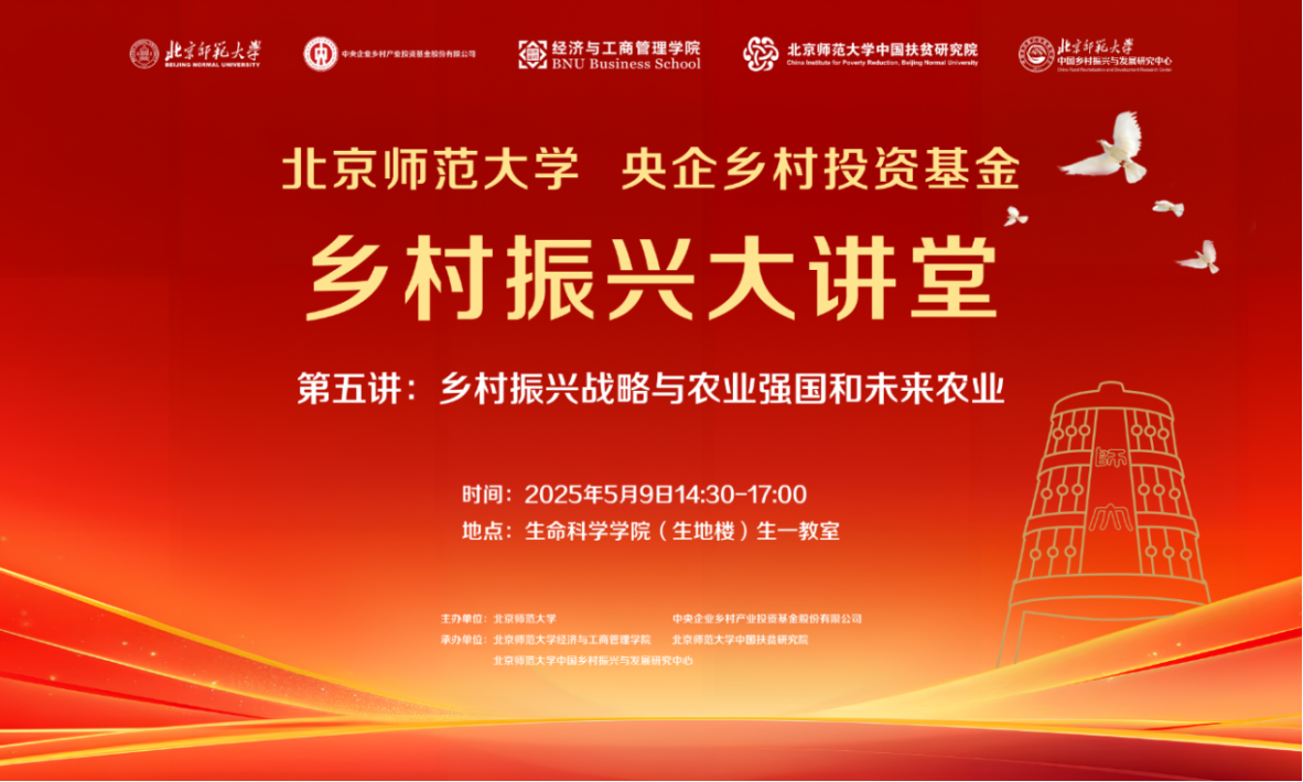 In order to make greater contributions to promoting the comprehensive revitalization of the countryside and accelerating the construction of an agricultural power, the 5th lecture of the "Beijing Normal University/Central Enterprise Rural Investment Fund · Rural Revitalization Lecture Hall", co-sponsored by Beijing Normal University and SDIC Chuangyi Industrial Fund Management Co., Ltd., undertaken by BNUBS, the China Poverty Alleviation Research Institute of Beijing Normal University, and the Center for Rural Revitalization and Development Research of Beijing Normal University, and co-organized by the Party Branch of Graduate Students in Economics and Resource Management of BNUBS, was held at Beijing Normal University on May 9, 2025. The purpose of the Rural Revitalization Lecture Hall is to invite renowned domestic experts and scholars to interpret theoretical hotspots and policy situations in the field of rural revitalization, and to build a characteristic propaganda carrier for central enterprises and university scientific research platforms to cooperate in serving national strategies.