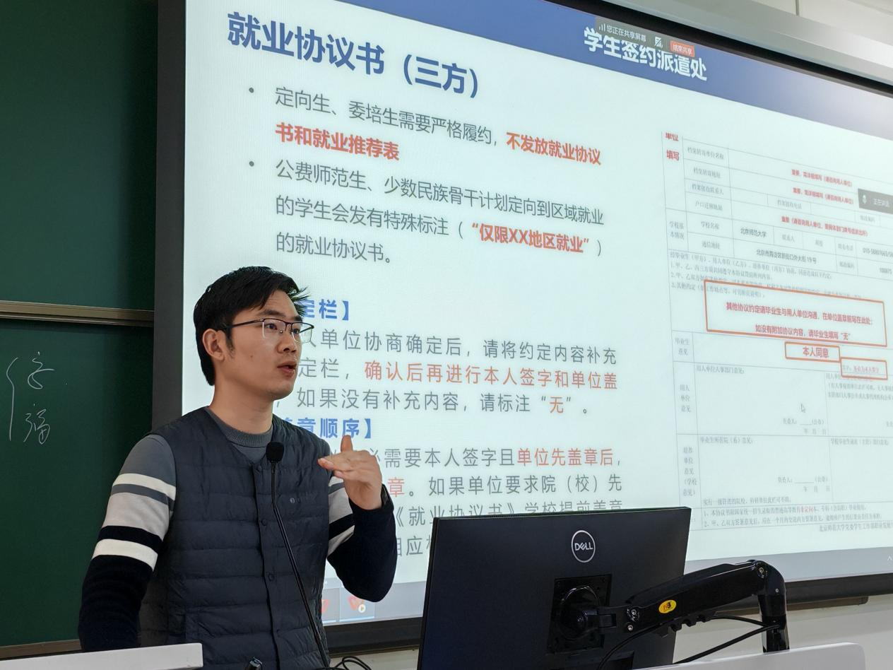 Teacher Li Lun provided a detailed interpretation of employment policies. He introduced talent introduction policies in some cities in China, major policy-related programs (such as the "Three Supports and One Assistance" program, special-post teachers program, Volunteer Service in Western China program, college students’ enlistment in the military, international organization internship programs, research and administrative assistant positions, and postgraduate recommendation for admission without examination), and other policy initiatives. In addition, he gave detailed answers to common employment issues of graduates, such as employment recommendation forms, employment agreements, household registration and file transfer, and reassignment procedures. He also explained the operation guidelines and precautions for filling in the employment dispatch system.