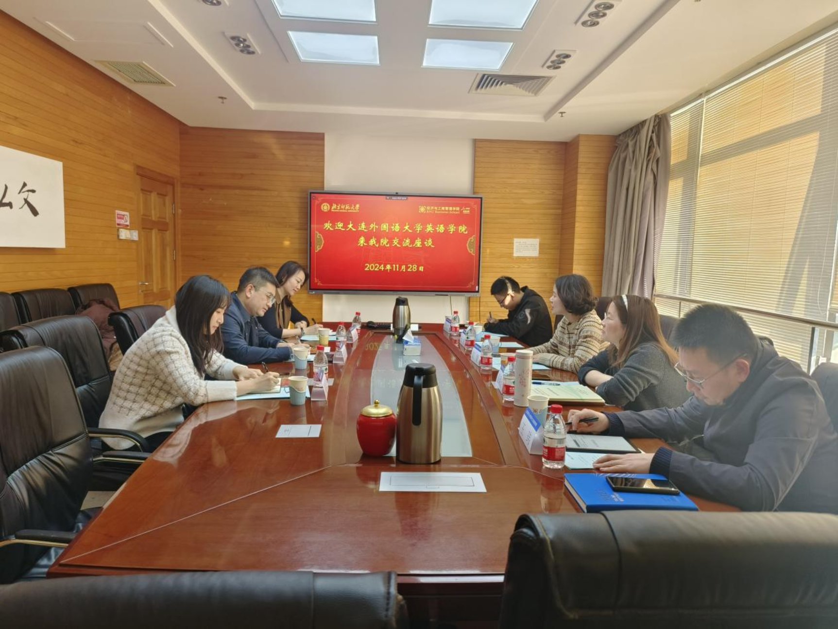 On the afternoon of November 28, 2024, Liang Ruobing, Secretary of the Party Committee and Associate Dean of the School of English at Dalian Foreign Studies University, Yu Hongxia, Director of the Business English major, and Huang Xinzhi, Secretary of the Graduate Party Branch, visited our School for research and exchange. Jiang Jie, Associate Secretary of the Party Committee and Associate Dean of the School, Tong Qionglu,Associate Director of the Department of Digital Economy and Management, Wang Wei, Office Director, Wang Jun, Party Committee Organizer, and Lu Yuchen, Secretary of the Graduate Party Branch of Economics and Resource Management, attended the research symposium.