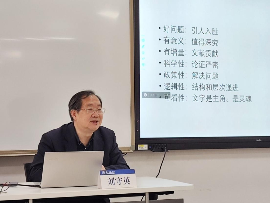 Liu Shouying, a distinguished professor of the "Yangtze River Scholars Award Program" of the Ministry of Education and the former dean of the School of Economics of Renmin University of China, gave a special lecture on "Some Basic Skills for Scientific Research". He outlined the current situation of scholars writing research papers, pointed out the problems existing in the research activities of young scholars, and explained the methods of conducting field investigations and problem oriented research methods. Finally, Professor Liu Shouying put forward suggestions on how to be a good policy consultant based on national policies, emphasizing that young scholars should improve their political stance, strengthen their sense of mission, polish their basic scientific research skills, and serve the major needs of the country with high-quality scientific research results.