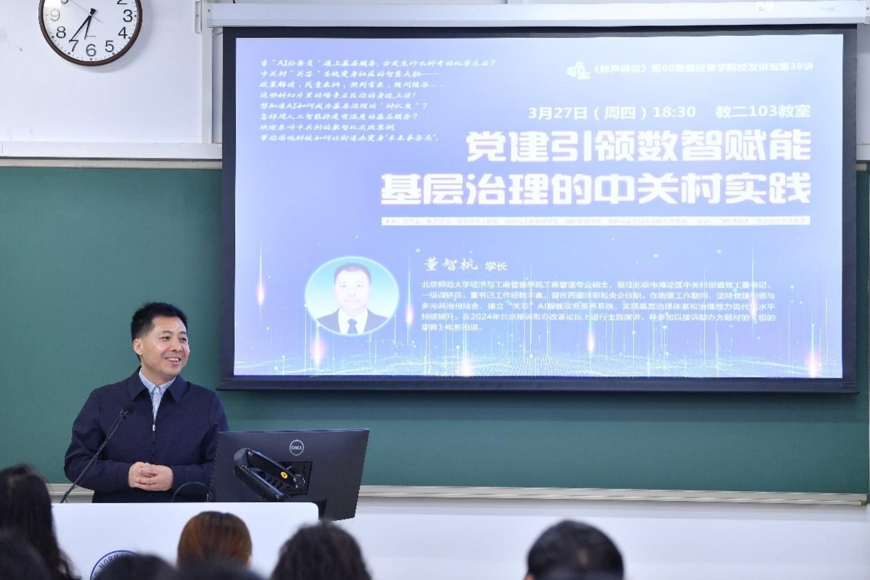 On the evening of March 27, 2025, the 60th session of the Duosheng Lecture Hall of the Alumni Association and the 38th lecture of the Alumni Forum of the Business School of Beijing Normal University (BNUBS) was successfully held in Classroom 103 of Teaching Building 2. This lecture specially invited Dong Zhihang, an MBA alumnus of the Class of 2008 from BNUBS and the Party Working Committee Secretary of Zhongguancun Sub - district, Haidian District, Beijing, as the keynote speaker. With the theme of "The Zhongguancun Practice of Party - Building - Led and Digital - Intelligence - Empowered Grassroots Governance", he presented an intellectual feast that deeply integrated theory and practice to the audience present. Fan Wenxia, the Secretary - General of the BNU Alumni Association, Hu Zhifeng, the Associate Secretary of the Party Committee of the University Administrative Organs, Ge Yuliang, a member of the Discipline Inspection Commission of the General Affairs Department of BNU, Yang Dan, an MBA alumnus of the Class of 2013 from BNUBS, the Chairman of Beijing Zhongguancun Internet Education Technology Service Co., Ltd., and the Director of the Zhongguancun Internet Education Innovation Center, and Han Lili, the Associate Secretary of the Party Committee of BNUBS, attended this event, which was hosted by Fan Zhe, the Associate Secretary - General of the BNU Alumni Association.