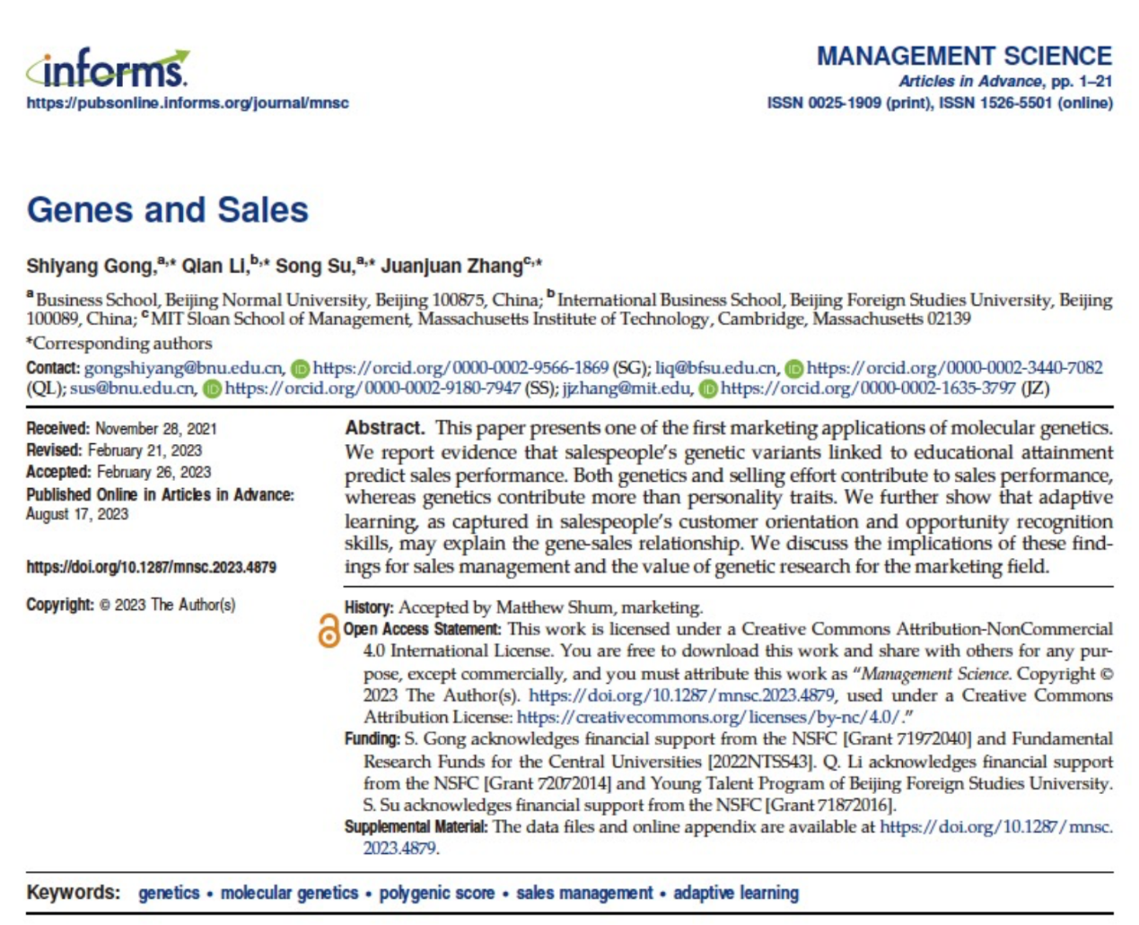 Recently, the academic paper Genes and Sales co-authored by Associate Professor Gong Shiyang and Professor Su Song from the Department of Digital Economy and Management of our School was published in Management Science, one of the top academic journals of management in UTDallas24. The achievement was jointly completed by our university and Professor Li Qian from Beijing Foreign Studies University and Professor Zhang Juanjuan from Massachusetts Institute of Technology. Associate Professor Gong Shiyang is the first author of the paper, and Professor Su Song is the corresponding author.