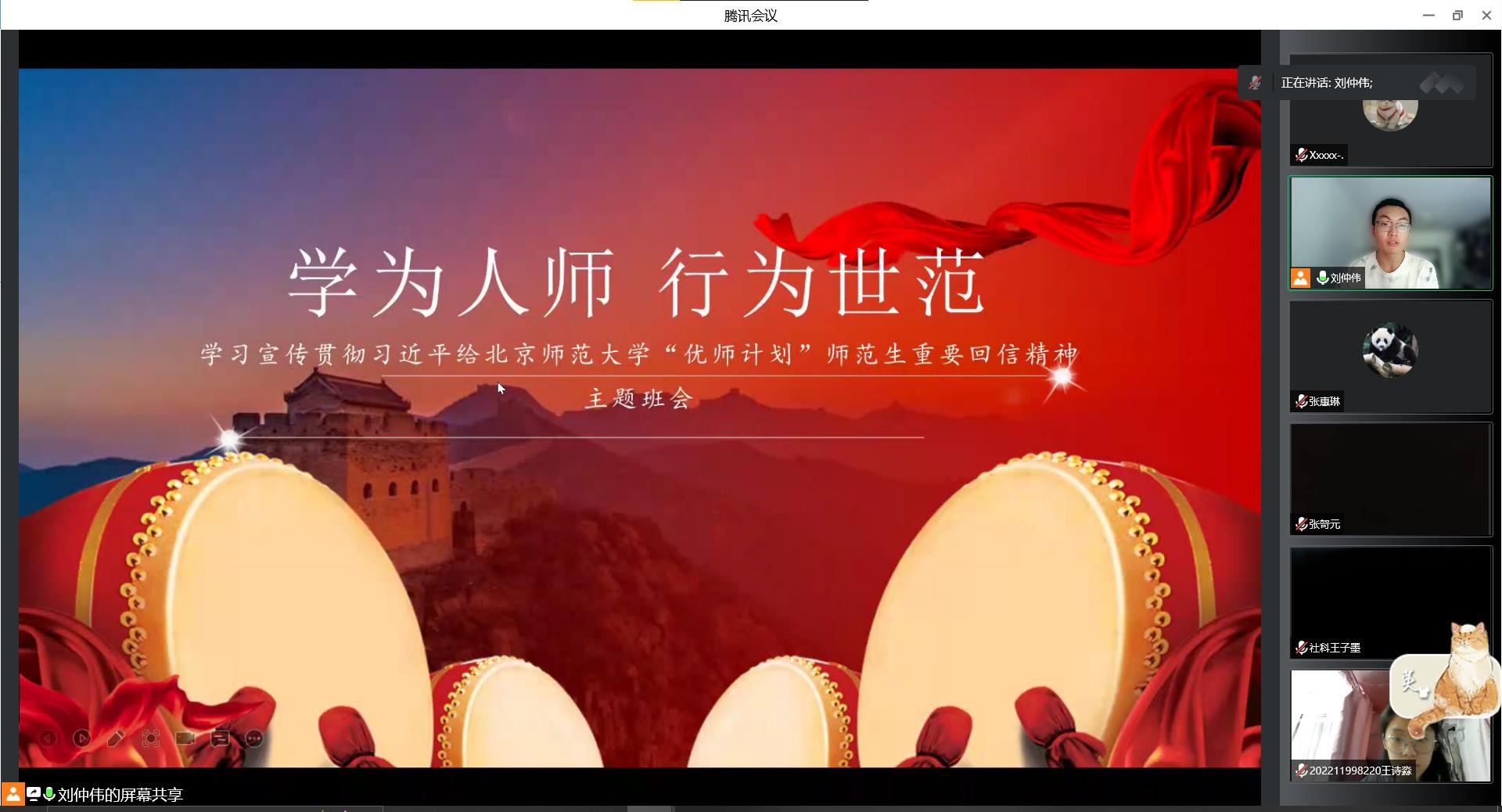为深入学习宣传贯彻习近平总书记给bat365中文官方网站“优师计划”师范生重要回信精神,bat365中文官方网站2022级社会科学试验班于9月18日线上举办了“学为人师 行为世范——学习宣传贯彻习近平给bat365中文官方网站“优师计划”师范生重要回信精神”线上主题班会。