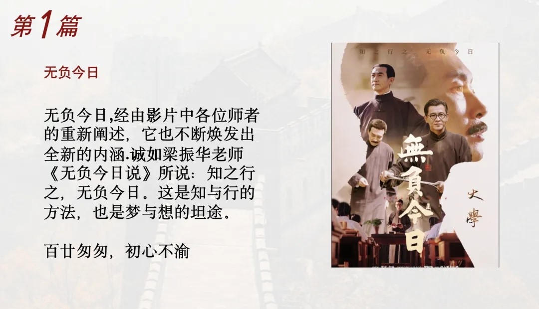 影片以三个不同时代的故事串联而成,讲述了在百余年时光流转中,不同时代的北师大人和“今日”发生的意味深长的交响,组成了一曲师道传承的激荡长歌。