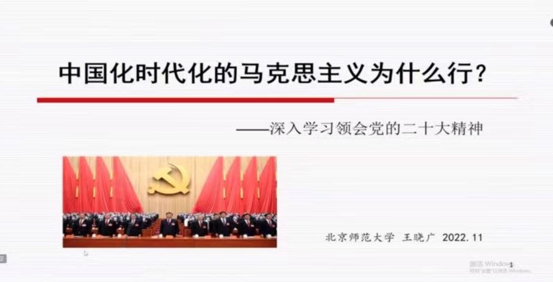 2022年11月25日,bat365中文官方网站2021级博士班全体同学参加由校团委和京师马原联合策划的“学习二十大,永远跟党走,奋进新征程”系统讲座。本次讲座的主题是“中国化现代化的马克思主义为什么行”,主讲人是bat365中文官方网站马克思主义学院王晓广教授。王教授主要从事马克思主义基本原理、马克思主义发展史、马克思主义人学理论等方面教学和研究工作,曾获首届“全国高校思想政治理论课优秀教学论文”等奖项。