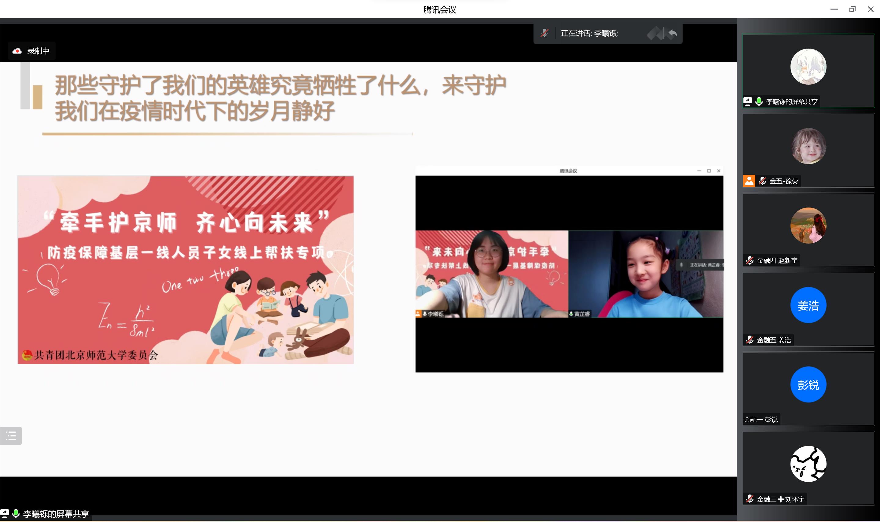 接着,物理学系2020级本科生李曦铄进行了“青春绽放在疫情时代”为主题的宣讲。她讲述了自己疫情期间居家备战高考的深刻记忆、进行专业填报时的慎重选择,以及进行线上支教、防疫活动和志愿辅导的亲身经历和深切感受,呼吁青年人在疫情时代,更应担当其时代重任,绽放自己的青春。