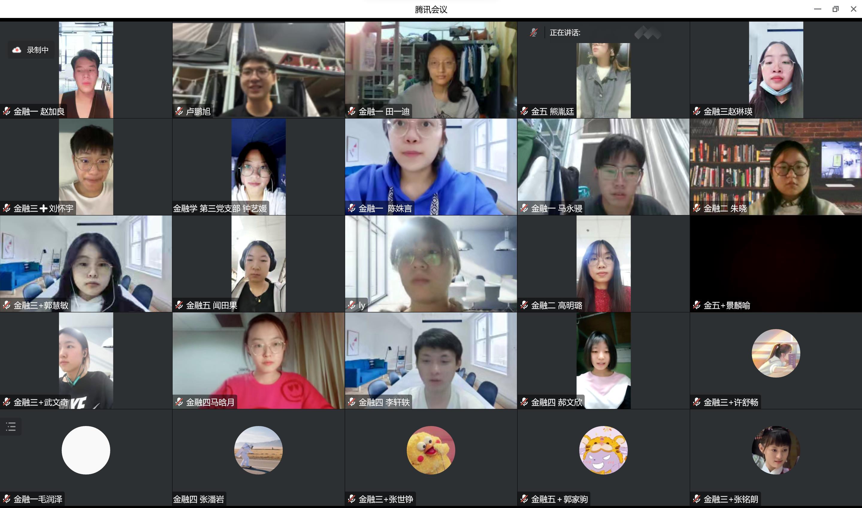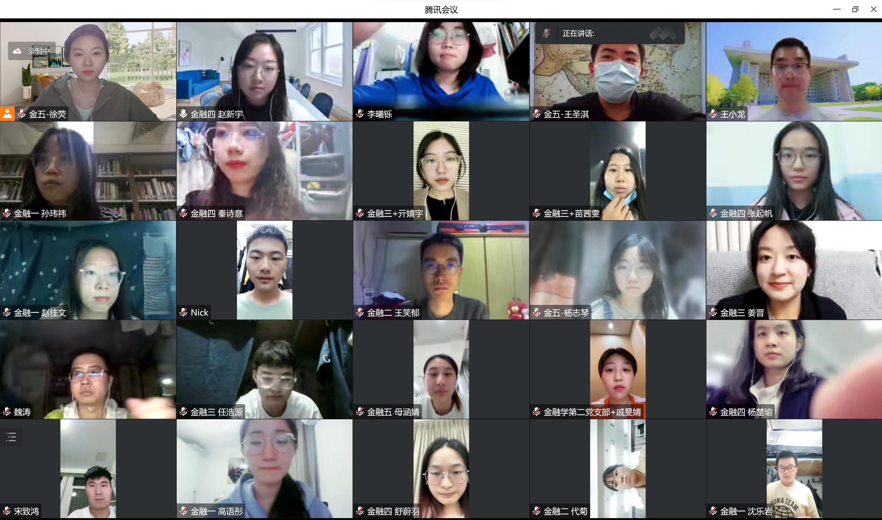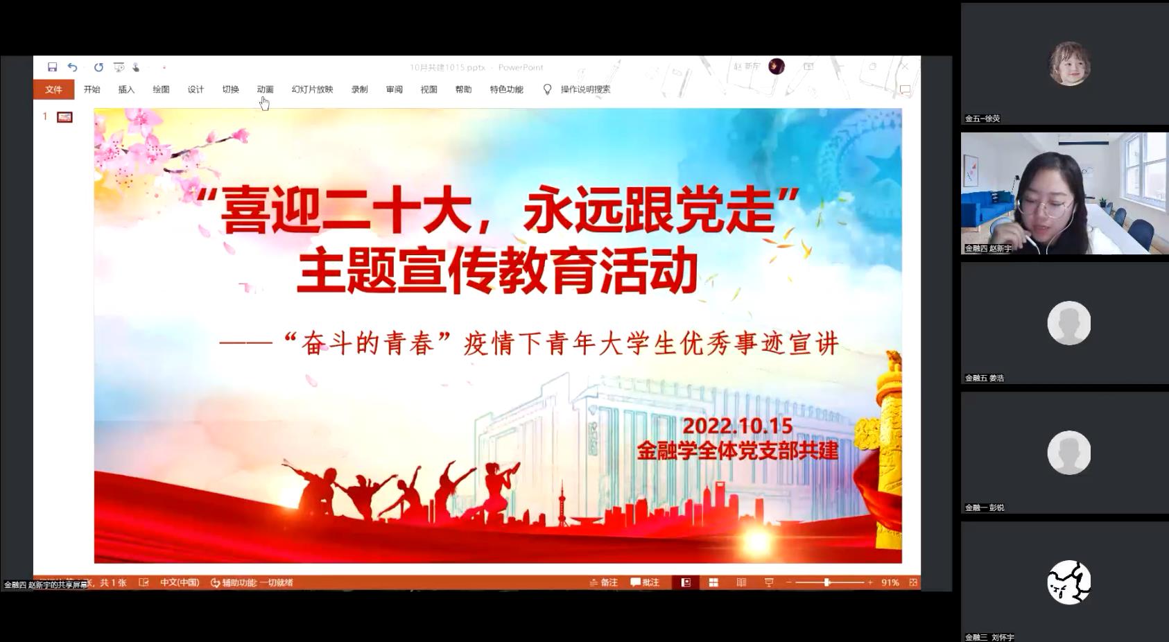 2022年10月15日,bat365中文官方网站金融学全体党支部通过腾讯会议线上平台联合召开“喜迎二十大,永远跟党走”主题宣传教育活动。通过云端支部共建,一起聆听“奋斗的青春”疫情下青年大学生优秀事迹宣讲。本次活动由金融学第四党支部书记赵新宇主持,参会正式党员、预备党员和入党积极分子共计102人。