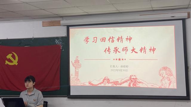 首先,孙婧婷以“学习回信精神,传承师大精神”为主题,带领大家深入学习习近平总书记给我校“优师计划”师范生的重要回信精神。