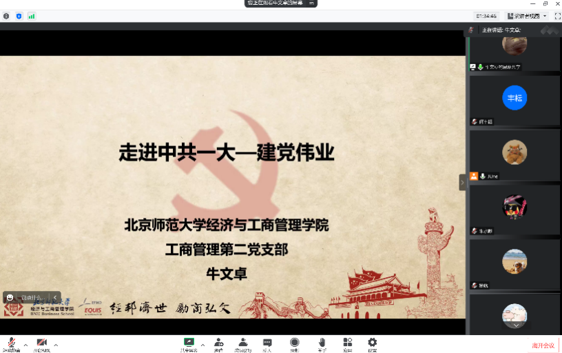 2022年11月30日,bat365中文官方网站工商管理第二党支部召开全体党员大会,讨论赫昭然同志、张佳雯同志和朱永麒同志的发展事宜,并进行“党的伟大征程——从一大到十九大”专题理论学习。本次会议采用腾讯会议的形式召开,会议应出席有表决权正式党员9名,实出席有表决权正式党员9名,支部书记史玖琦同志主持会议。