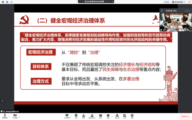 首先,郑舒婷和李秋远同学带领支部成员共同学习党的二十大报告精神中关于“构建高水平社会主义市场经济体制”的论述。她们讲到,构建高水平社会主义市场经济体制,一是要坚持“两个毫不动摇”,明确公有制经济和非公有制经济都是社会主义市场经济的重要组成部分,推动国有资本和国有企业做强做优做大,发展壮大民营经济。二是要深化要素市场化改革。郑舒婷同学借助广东省“数据经纪人”试点的案例针对数据要素的市场化改革展开深入阐述。三是要健全宏观经济治理体系。完善产权保护、市场准入、公平竞争、社会信用等市场经济基础制度,优化营商环境。四是要完善现代金融监管。李秋远同学结合本专业知识阐释了报告中系统性风险的相关内容。