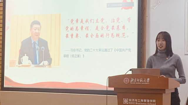 其次,由第一学习小组同志带领大家进行专题学习。伏璐同学带领支部成员对比学习党章修正前后的部分内容,提示要全面把握党章修正的部分,其中包括对于习近平新时代中国特色社会主义思想的科学内涵和历史定位的补充,引入马克思主义中国化等内容。彭忆冰同志对习近平总书记在二十届一中全会上的重要讲话精神进行了简单解读,强调要全面贯彻落实党的二十大精神,做到学用结合。随后,几位新加入党支部的积极分子针对此次学习内容分享感悟,表示要加强对党章的学习,深刻领悟党的路线方针政策,做事脚踏实地,坚定不移听党话,跟党走。