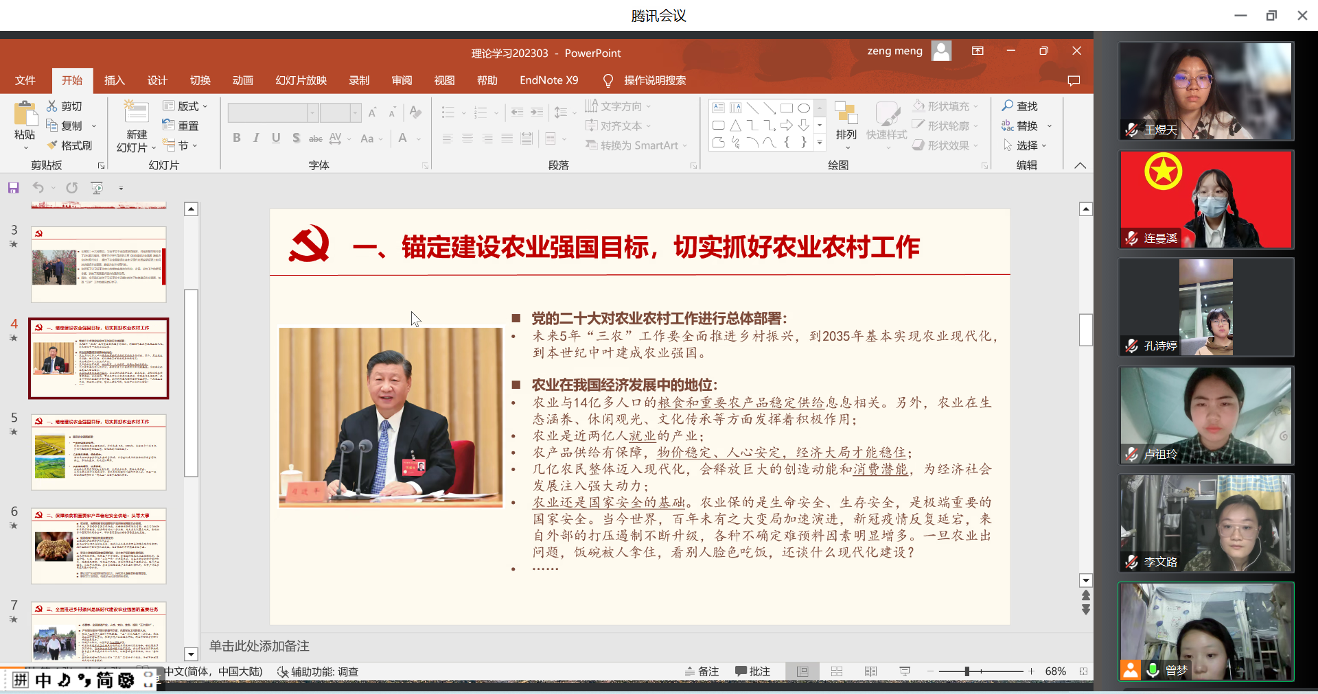 2023年3月30日,bat365中文官方网站经济学第五党支部于线上召开本月理论学习会。会议围绕习近平总书记在《求是》杂志上发表的《加快建设农业强国 推进农业农村现代化》重要文章展开专题学习和讨论。会议由支部组织委员曾梦同学主持,支部党员及积极分子总计25人参加。