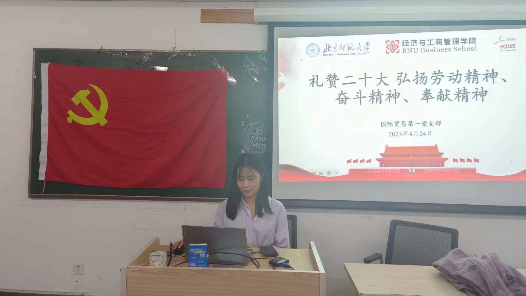首先,赵凡同学以“礼赞二十大,弘扬劳动精神、奋斗精神、奉献精神”为主题讲授党课。党的二十大报告指出:在全社会弘扬劳动精神、奋斗精神、奉献精神、创造精神、勤俭节约精神,培育时代新风新貌。她阐述了劳动精神、奋斗精神、奉献精神的重要意义和深刻内涵,并以屠呦呦、钟南山、袁隆平三位优秀榜样的事迹展现了劳动精神的实质,以中国高铁轨道技术创新团队的事迹展现了奋斗精神的意蕴,以北师大优秀校友黄文秀的事迹充分展现了奉献精神的内涵。