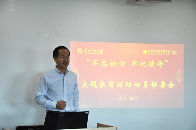 会议由孙志军主持。孙志军书记首先介绍了“不忘初心、牢记使命”主题教育活动指导思想和总体要求。他指出,本次教育活动以“不忘初心、牢记使命”为主题,以“守初心、担使命,找差距、抓落实”为总要求,以对标“理论学习有收获、思想政治受洗礼、干事创业敢担当、为民服务解难题、清正廉洁作表率”为目标任务。本次主题教育活动要与落实立德树人根本任务、加强和改善党的全面领导、校内巡查督查工作、落实学校第十三次党代会精神和学校学院“十三五”规划部署、推进以北京校区和珠海校区为两翼的一体化办学格局、服务保障新中国成立70周年庆祝活动、维护校园和谐稳定紧密结合,从而为提升学院党建质量,加快推进“双一流”建设提供坚强保证。