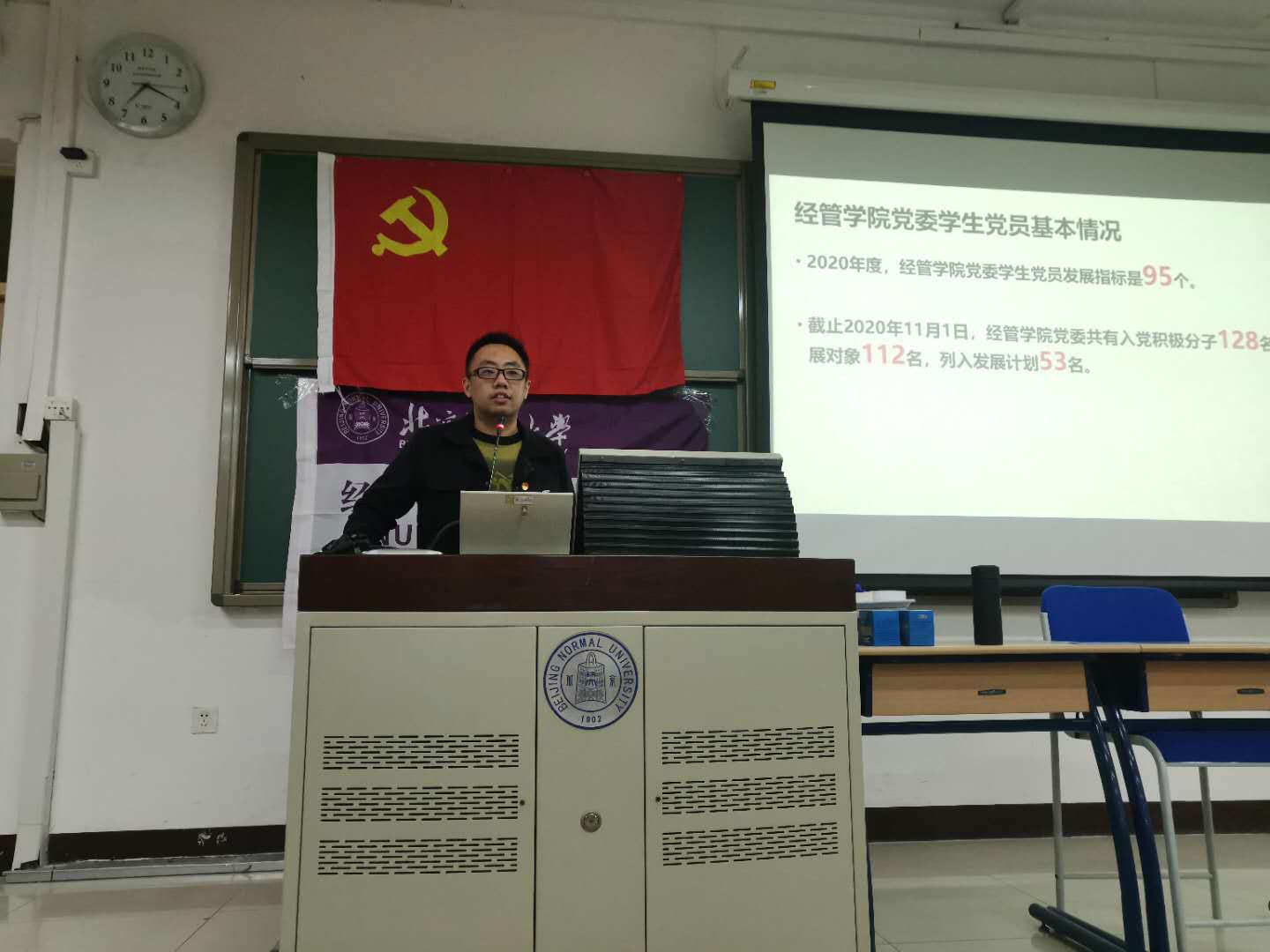 大会第四项,王骏老师做入党培训。首先,王骏老师介绍了经管学院党委学生党支部、学生党员的基本情况,介绍了学生党员发展的基本情况,截至2020年11月1日,学院党委共有学生党支部16个,学生党员386人(含预备党员105名),入党积极分子128名,发展对象112名,本学期列入发展计划的53名。其次,王骏老师从指导思想、组织建制、培训对象、培训环节等方面对经管学院二级党校进行了全面回顾,并对学院党建教育培养体系进行了全面介绍,对第九期培训资格测试情况进行了反馈,并对本期培训各培养环节进行了详细说明。最后,王骏老师对学院党委入党流程和材料要求进行简要介绍,并要求同学们按照相关要求保质保量完成教育培养考察工作。