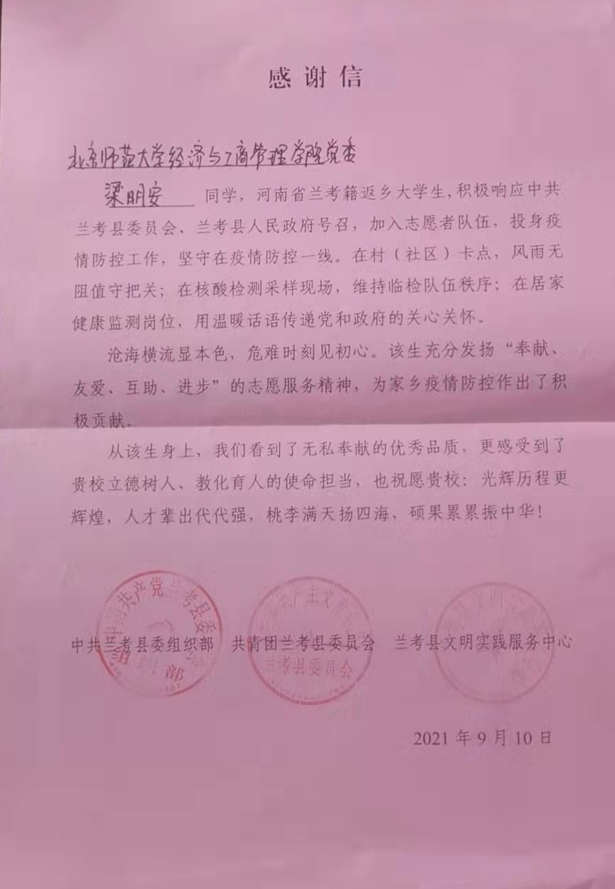 近日,bat365党委收到中共兰考县委组织部、共青团兰考县委员会和兰考县文明实践服务中心寄来的对bat365硕士研究生梁明安同学的感谢信。信中提到,梁明安同学作为河南省兰考籍返乡大学生,积极投身疫情防控工作,充分发扬了“奉献、友爱、互助、进步”的志愿服务精神,展现了bat365中文官方网站立德树人、教化育人的使命担当。目前,该生已于2021年9月17日向学院党委正式提交了入党申请书。