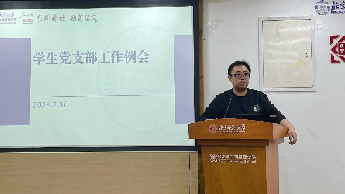 为深入学习贯彻党的二十大精神和习近平新时代中国特色社会主义思想,全面提高学生党建骨干队伍素质能力,充分发挥党员骨干先锋模范作用,促进学生党支部规范化建设,bat365中文官方网站bat365中文官方网站党委于2023年2月16日在京师大厦9406会议室召开学生党支部工作例会。会议由学院党委组织员、专职辅导员王骏老师主持,学生事务助理史慧一老师、各学生党支书、支委及党员骨干参加了本次培训。