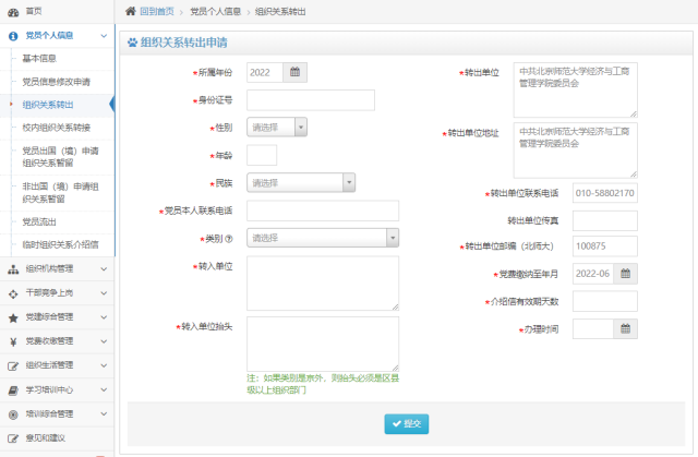 转京内:转入单位必须精确到党支部,并务必备注该支部在“党员E先锋”系统里的党支部全称组织编码,转入单位抬头为转入党支部所在党委。