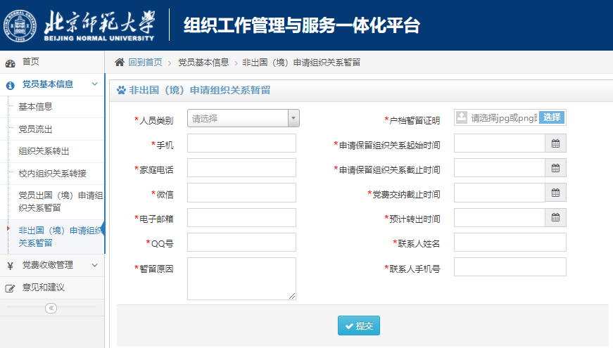 登陆学校组织工作管理一体化平台(http://zzbgz.bnu.edu.cn/,账号和密码同数字京师),提交党员组织关系暂留申请。