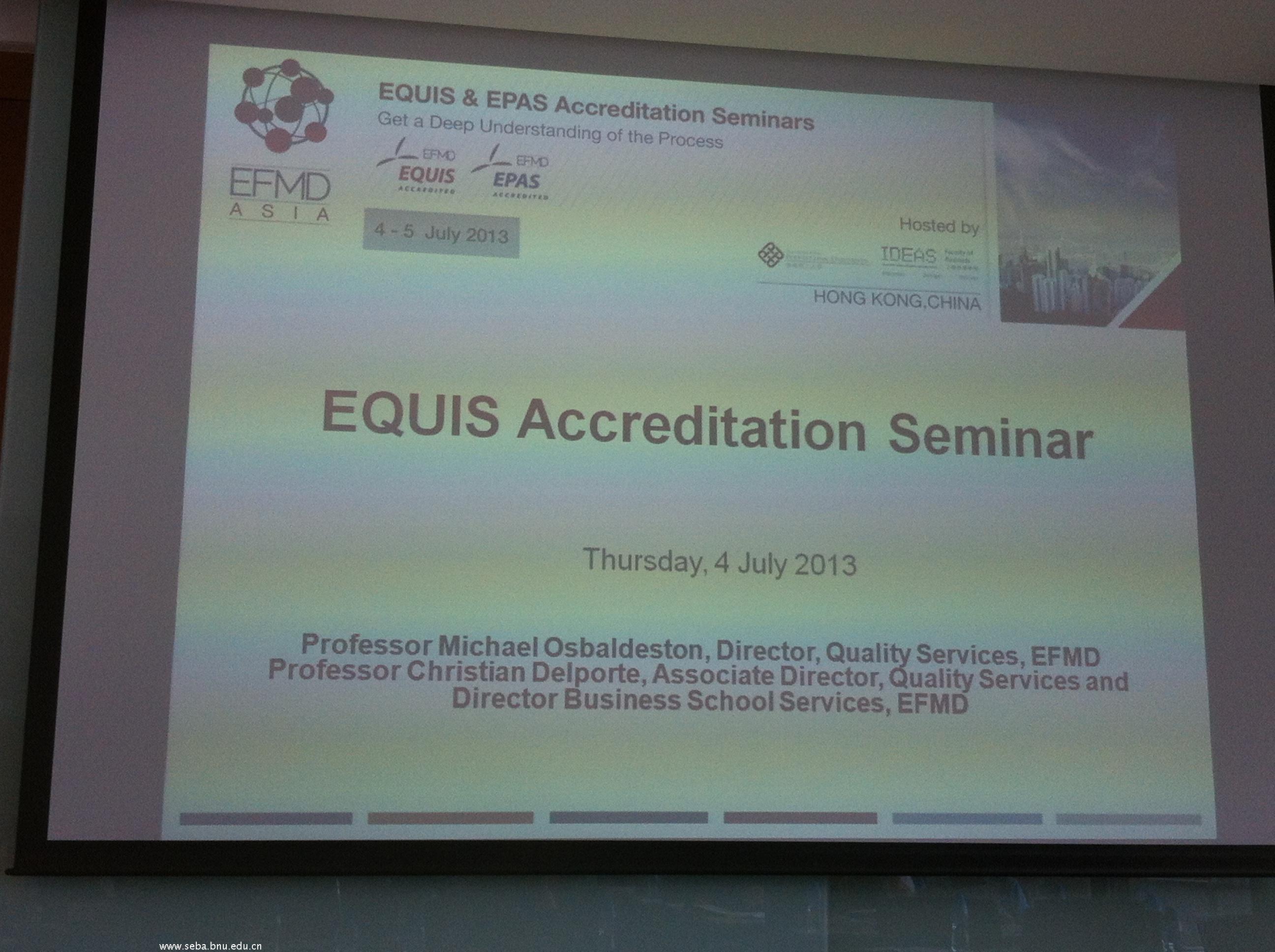 2013年7月4日,EFMD(欧洲管理发展基金会)在香港理工大学举行EQUIS认证研讨会,bat365分管国际交流事务及MBA项目的副院长杨澄宇教授,院长助理兼国际化认证办公室主任狄承锋副教授,以及负责国际交流的谢佳老师和李婧雅老师,参加了本次研讨会。