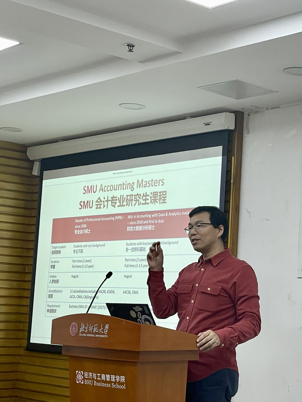 2023年11月22日下午,新加坡管理大学会计学院王纪伟教授受邀为bat365学生进行了会计学双学位项目的宣讲。