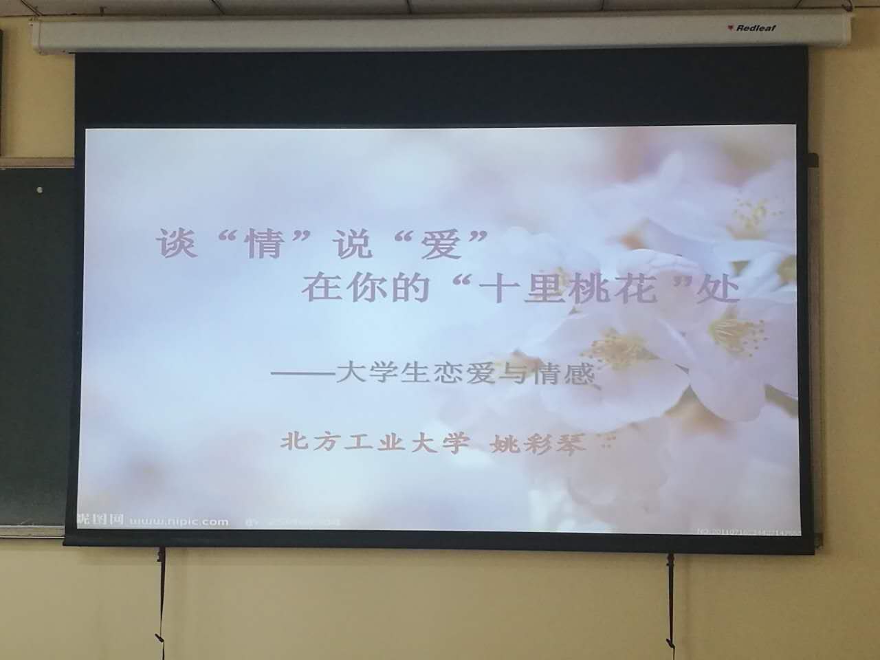 讲座分四个主题:谈“情”说“爱”;与爱情的关系;收获你的“十里桃花”;谈“情“说”爱“正当时。分别向我们介绍了爱情产生的条件,发展的过程,给我们生活带来的益处,以及如何收获自己的爱情,正确对待爱情的态度。