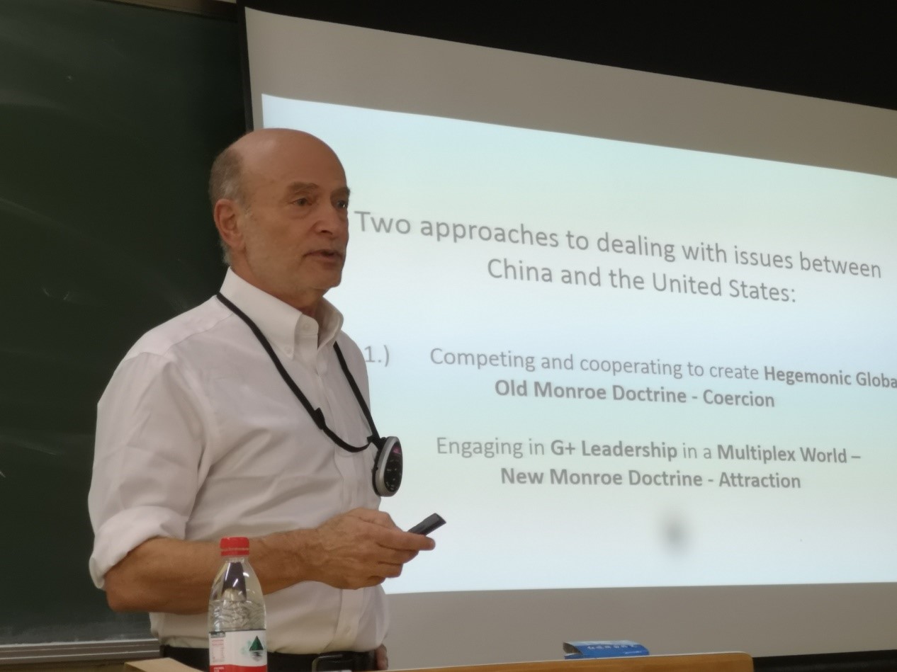 对于21世纪的地区合作与发展,Louis教授也分享了他的见解。他用Monroe Doctrine(门罗主义)为理论背景,提出了The Old Monroe Doctrine:Coercion与The New Monroe Doctrine:Attraction两种不同的模式,并引出了G+ Leadership这一理论。
