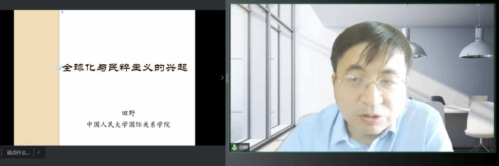 4月13日,中国人民大学开云kaiyun官方网站教授、比较国际政治经济研究所所长,教育部青年长江学者田野教授受邀至kaiyun官方网站入口“国关讲堂”,为众师生带来一场题为“全球化与民粹主义”的学术报告。报告会以视频会议的方式举行,由开云官网李永成教授主持、校内外二百七十余位师生共同参与。