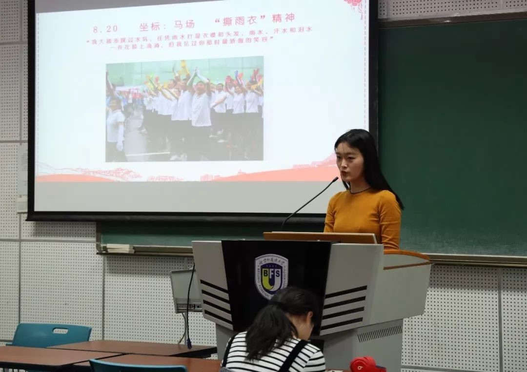 三个月的训练,令人激动的事情太多了。来自26方阵的马璐同学分享了她所在方阵的“撕雨衣精神”,打动了在场的每一位同学。“那天在马场验收,雨下的很大。我们穿着雨衣走完了前两遍,但是雨衣妨碍了动作的展示,有可能会影响分数。最后一遍要打分,准备出发时突然有同学撕掉了自己的雨衣。先是一个同学、几个同学,然后是一排同学、一个小队的同学、一个学校的同学,最后是整个方队都撕掉了自己的雨衣。雨下的很大,北外的女同学们头发衣服都湿透了。我们仰着头、迎着雨,欢呼跳跃,已经分不清脸上是雨水还是激动的泪水。”
