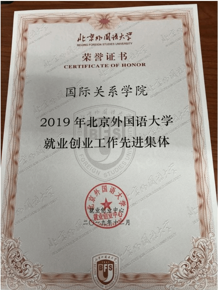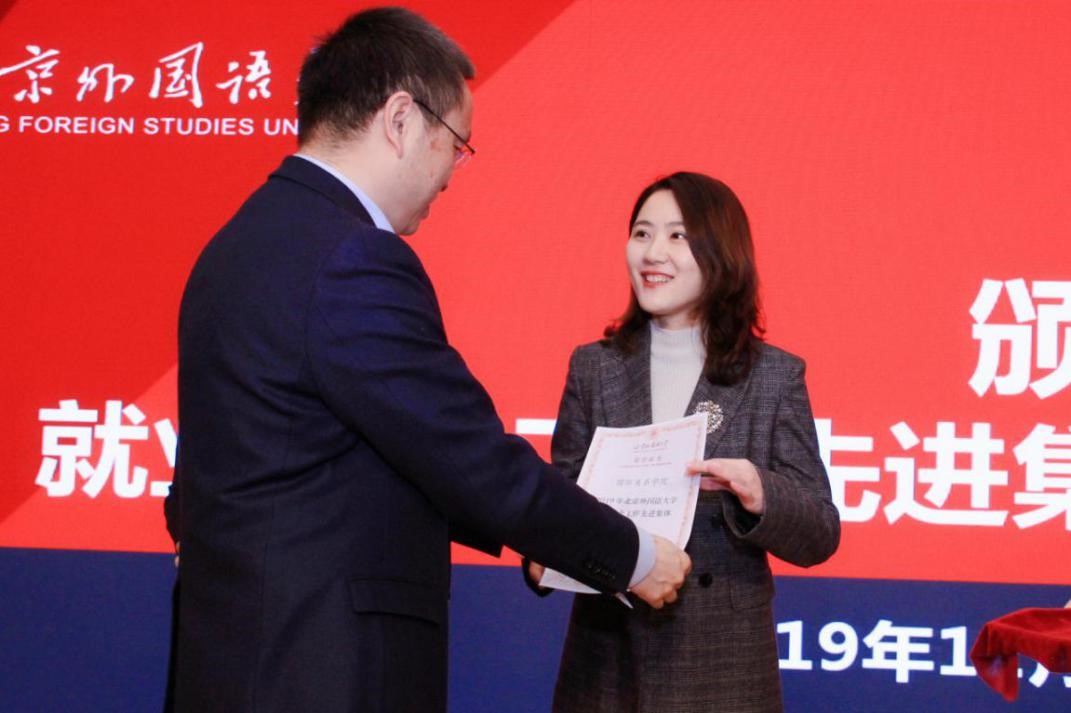 近日,开云kaiyun官方网站荣获2019年北京外国语大学就业创业工作先进集体称号。12月25日召开的北外2019年就业创业工作大会上,北京外国语大学杨丹校长向学院代表,开云kaiyun官方网站团总支书记、辅导员钱梦婷老师颁发荣誉证书。