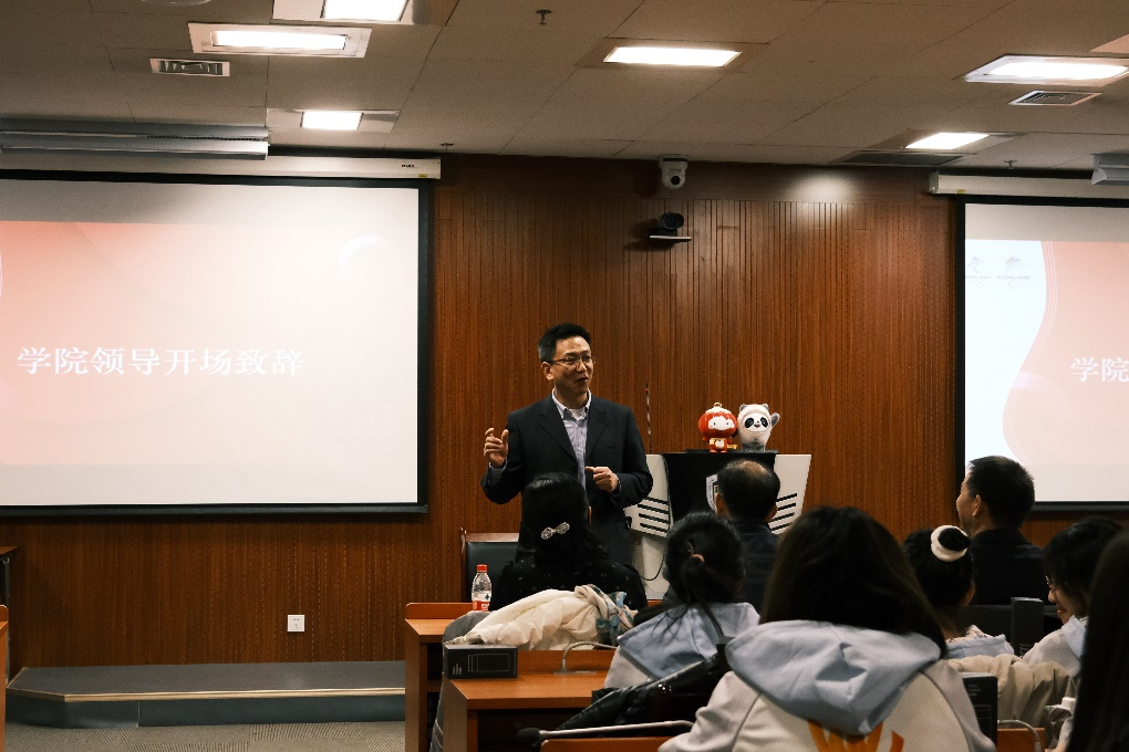 随后,谢韬院长代表学院致辞。谢韬院长首先向志愿者们表示了鼓励和肯定,希望志愿者们能够在冬奥会中积极奉献,勇于担当,在完成好志愿服务工作的同时遵守疫情防控要求,做好自我保护,并表示学院随时为大家提供帮助。